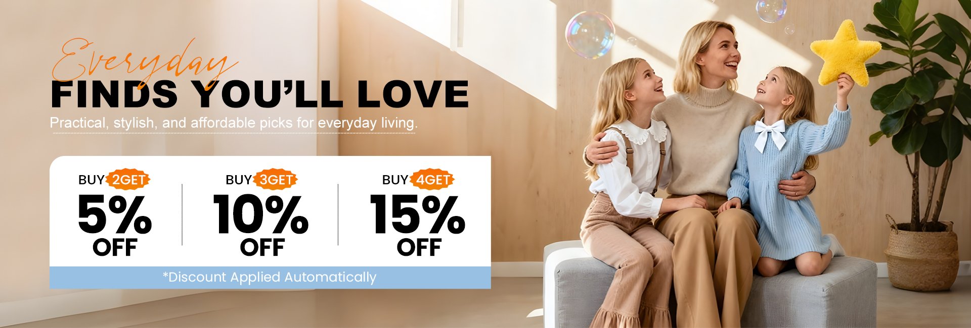 2 items -5% | 3 items -10% | 4 items -15%